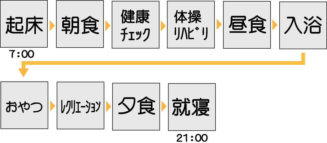 ※一日の流れを参考までに紹介させていただいております。ご利用者様のご希望や体調に合わせて、調整することもできますので、ご相談ください。